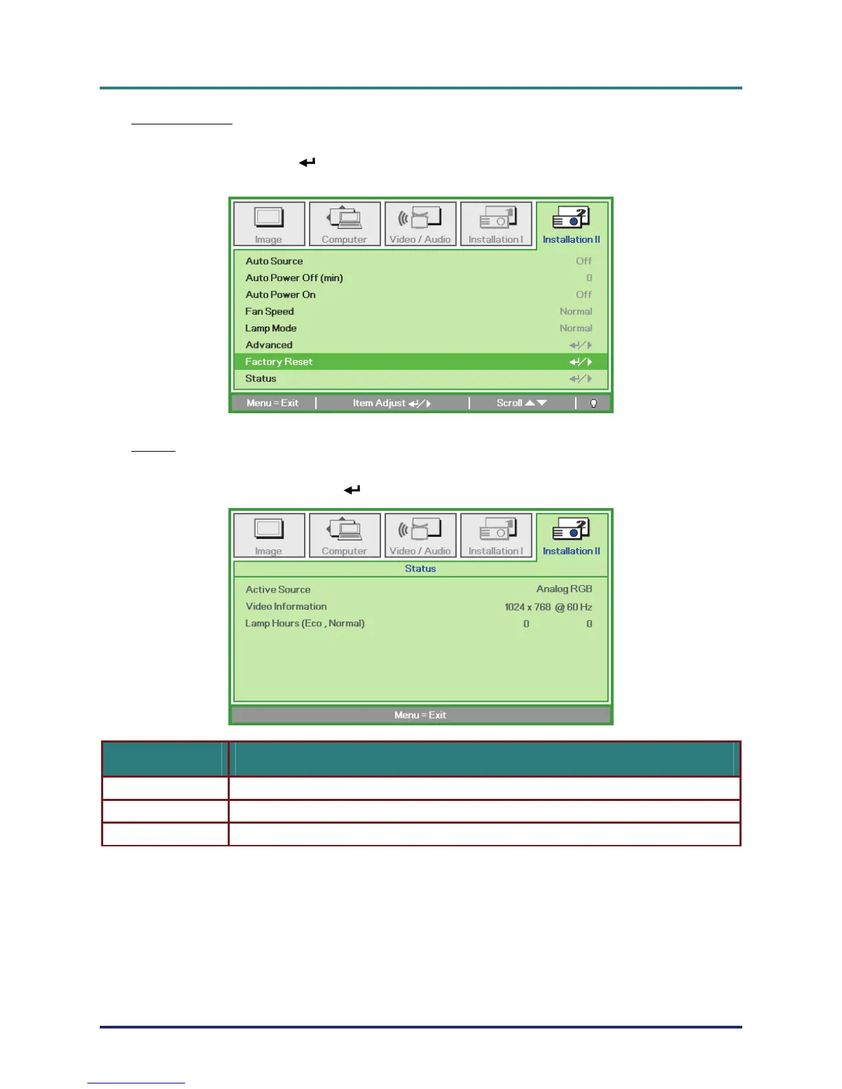 Lamp Hours Lamp hour used information is displayed. Eco and Normal counters are separated.