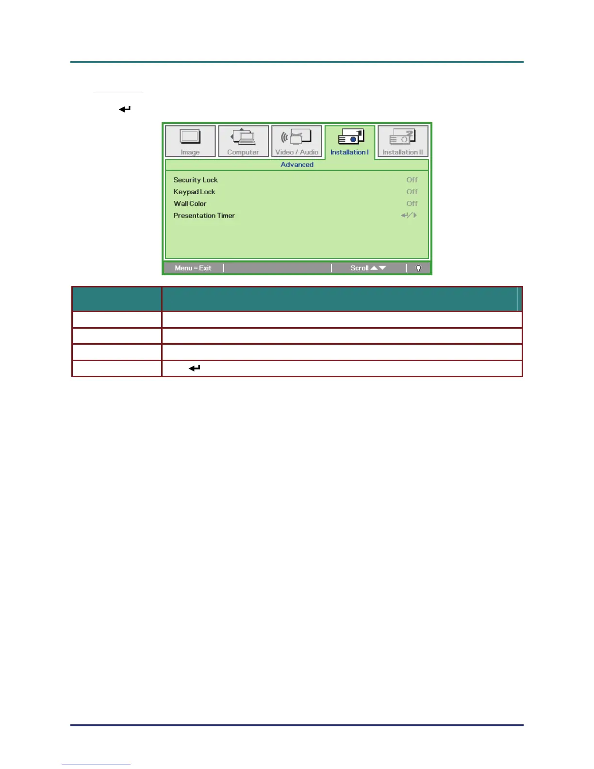 Presentation Timer Press (Enter) / モ to enter the Presentation menu. See Presentation Timer on page 32.