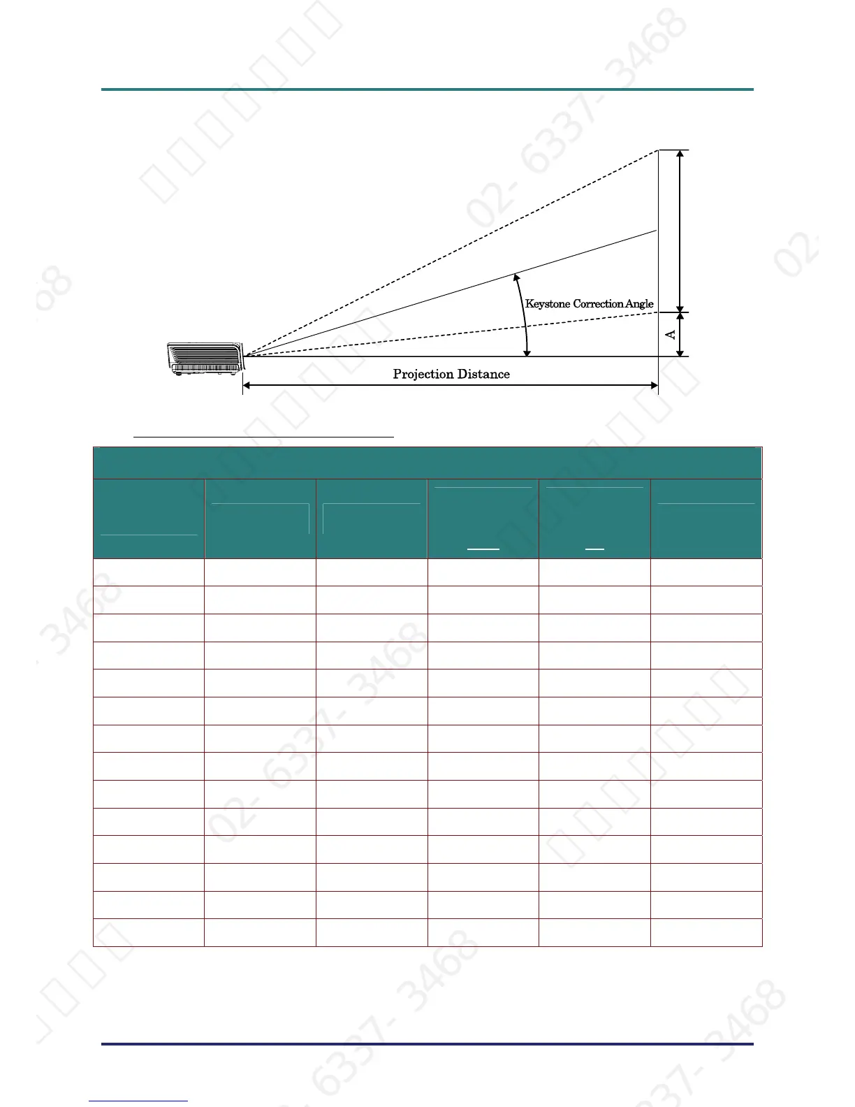 Projection Distance and Size Table