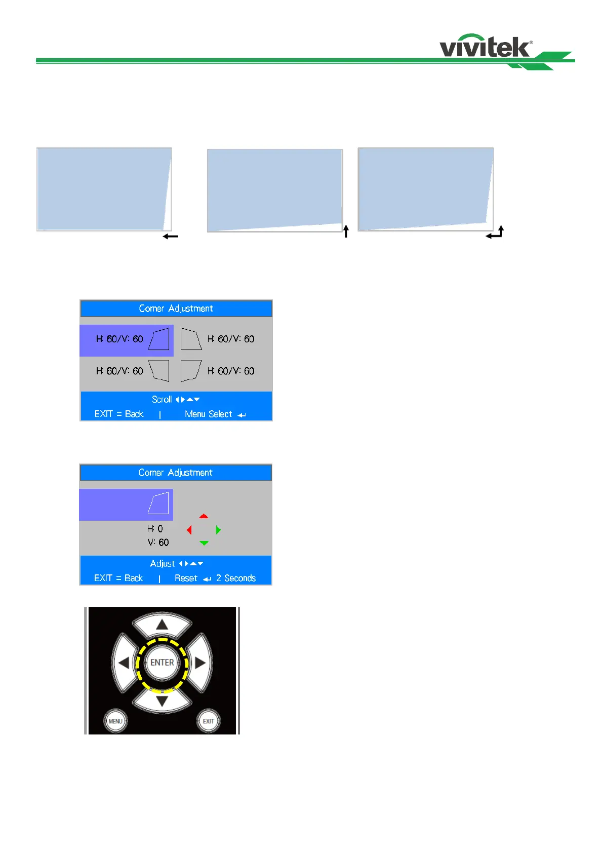 4. Press and hold the Enter button around 2 seconds to reset the corner adjustment.