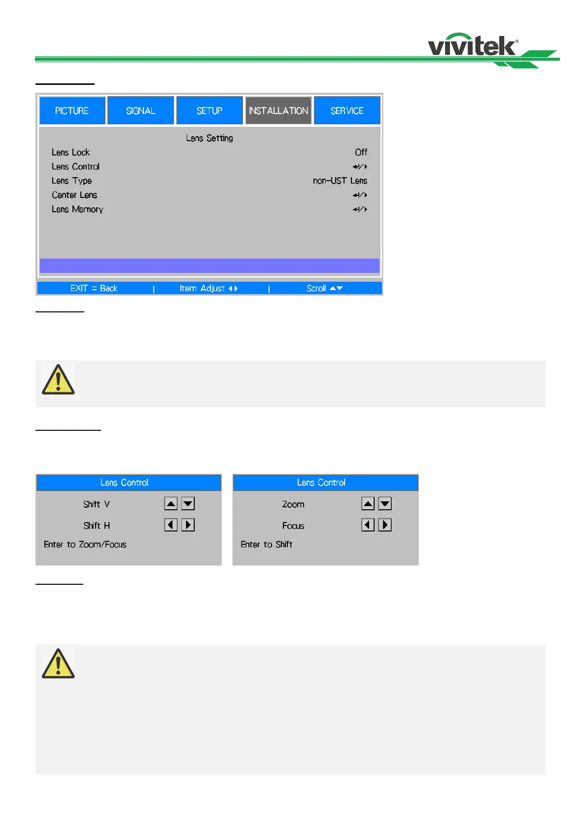 related functions including Lens Shift, Zoom/Focus adjustment and Center Lens. Recommend to turn on Lens Lock