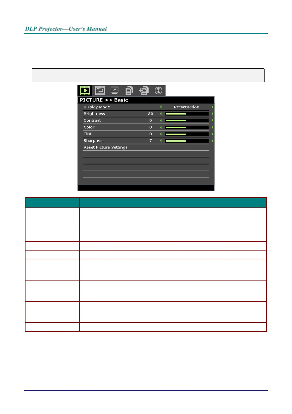 >> Basic menu. Press the cursor ▲ / ▼ buttons to move up and down in the PICTURE >> Basic menu.