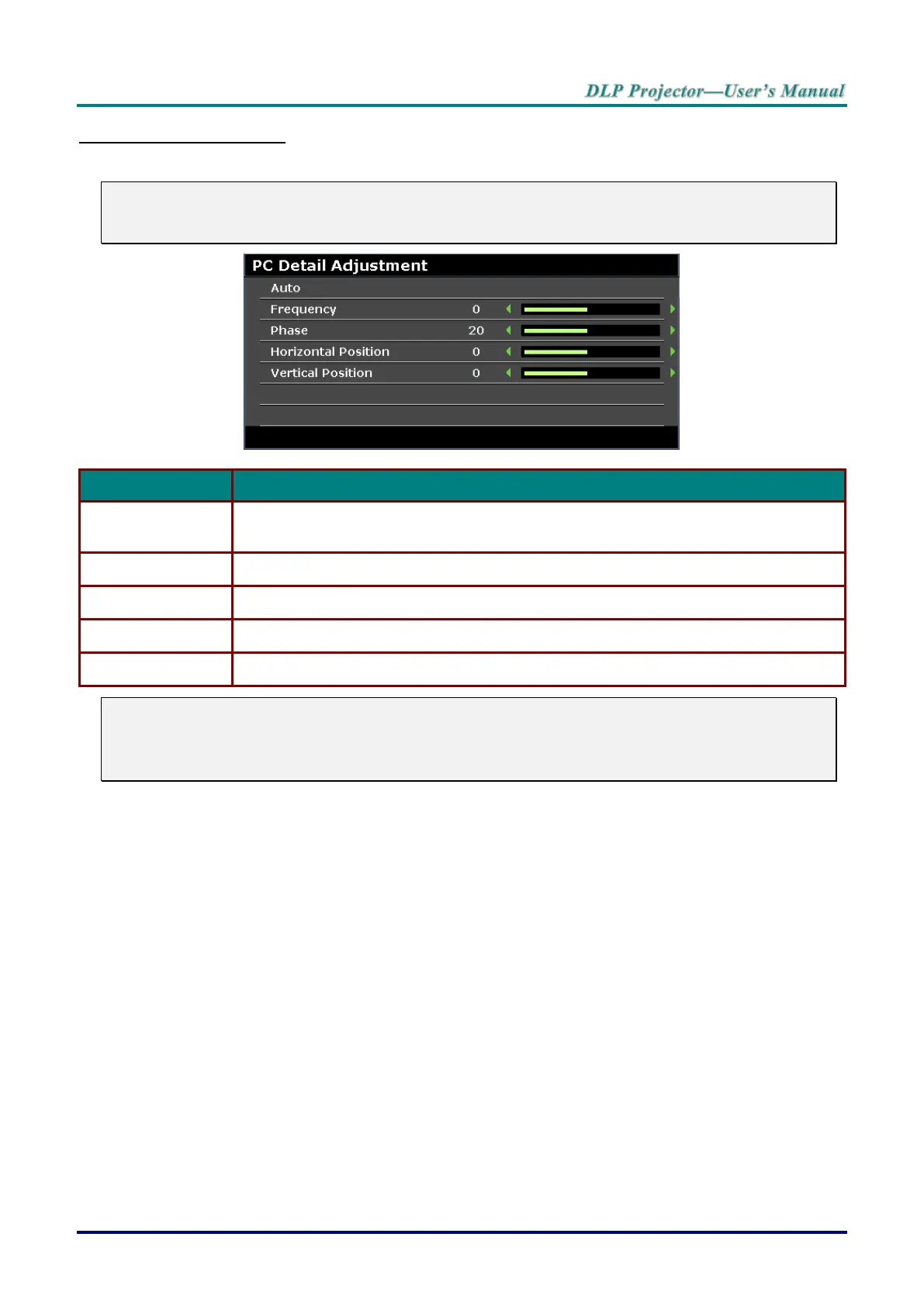 If the Auto Adjust operation cannot optimize the PC signal, try to adjust Frequency and Phase