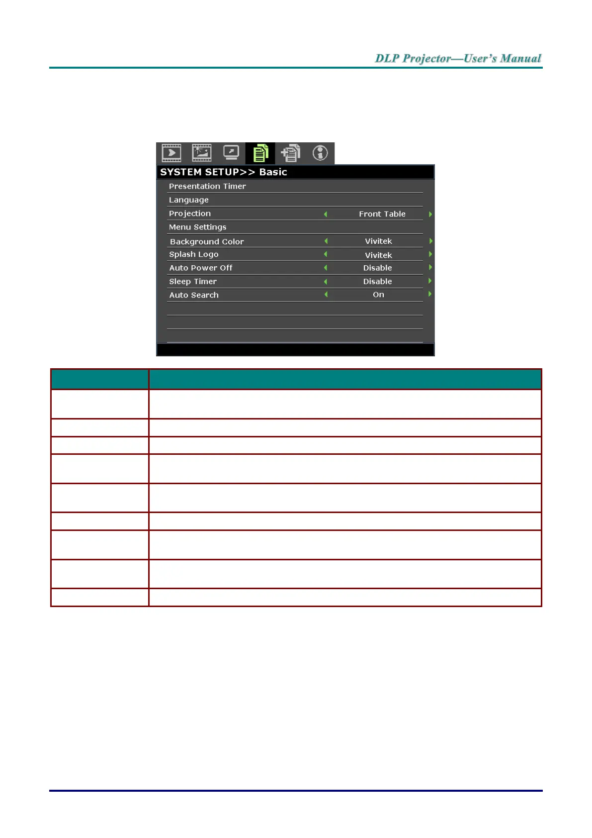SYSTEM SETUP >> BASIC menu. Press the cursor ◄ / ► buttons to change values for settings.