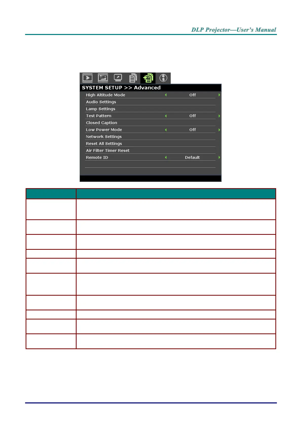 SETUP >> Advanced menu. Press the cursor ▲ / ▼ buttons to move up and down in the SYSTEM