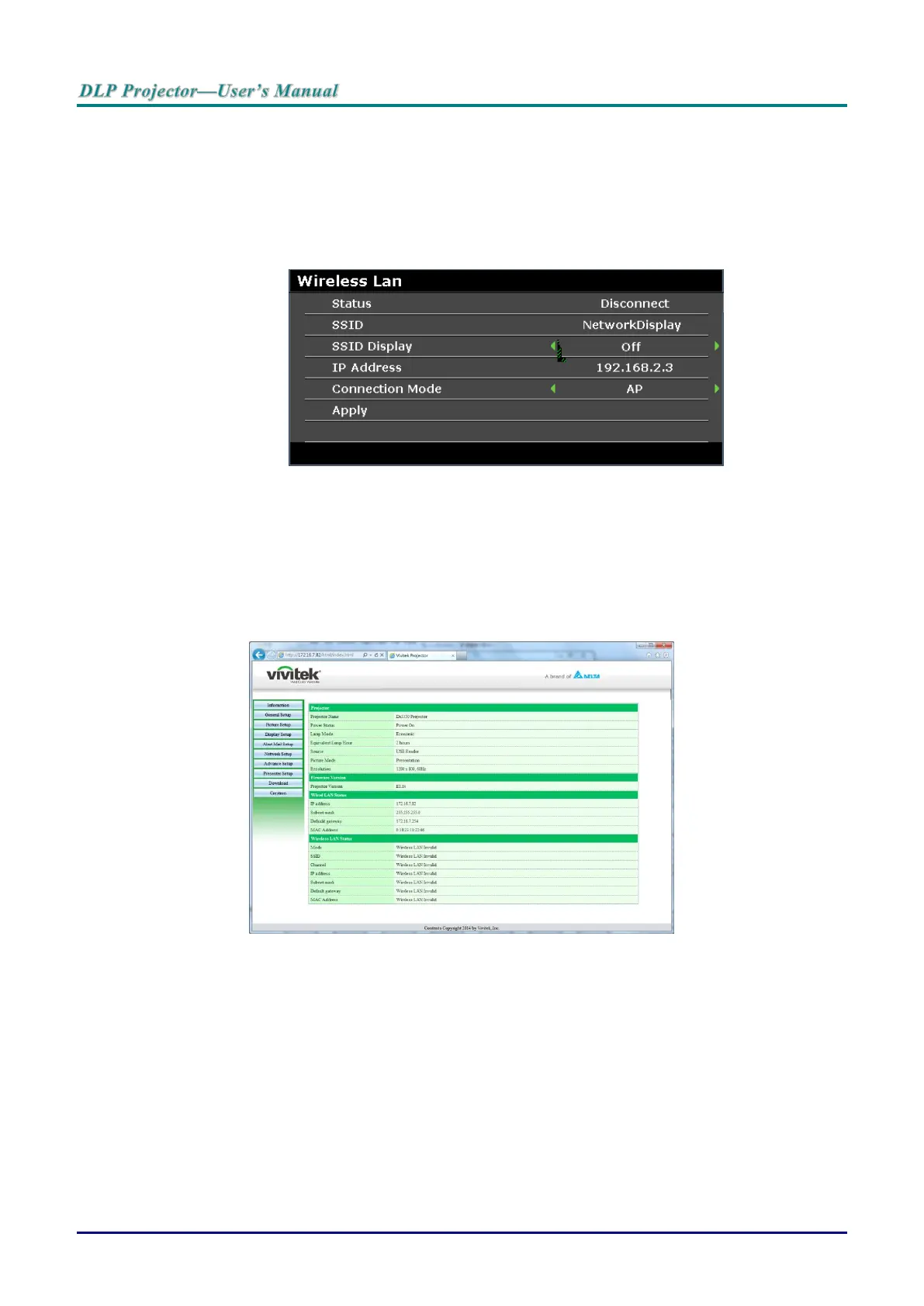 The Information page displays the information and status of this projector.