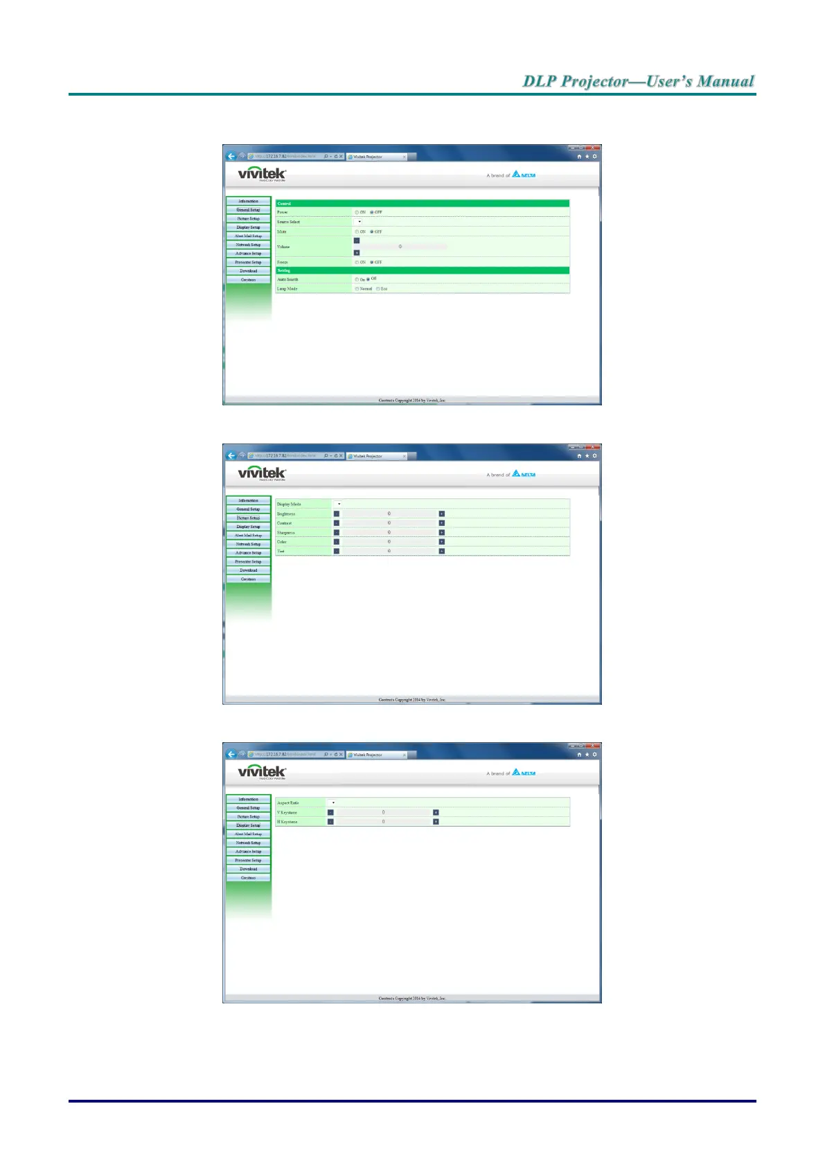 The Display Setup page provides keystone and aspect ratio adjustment functionality.