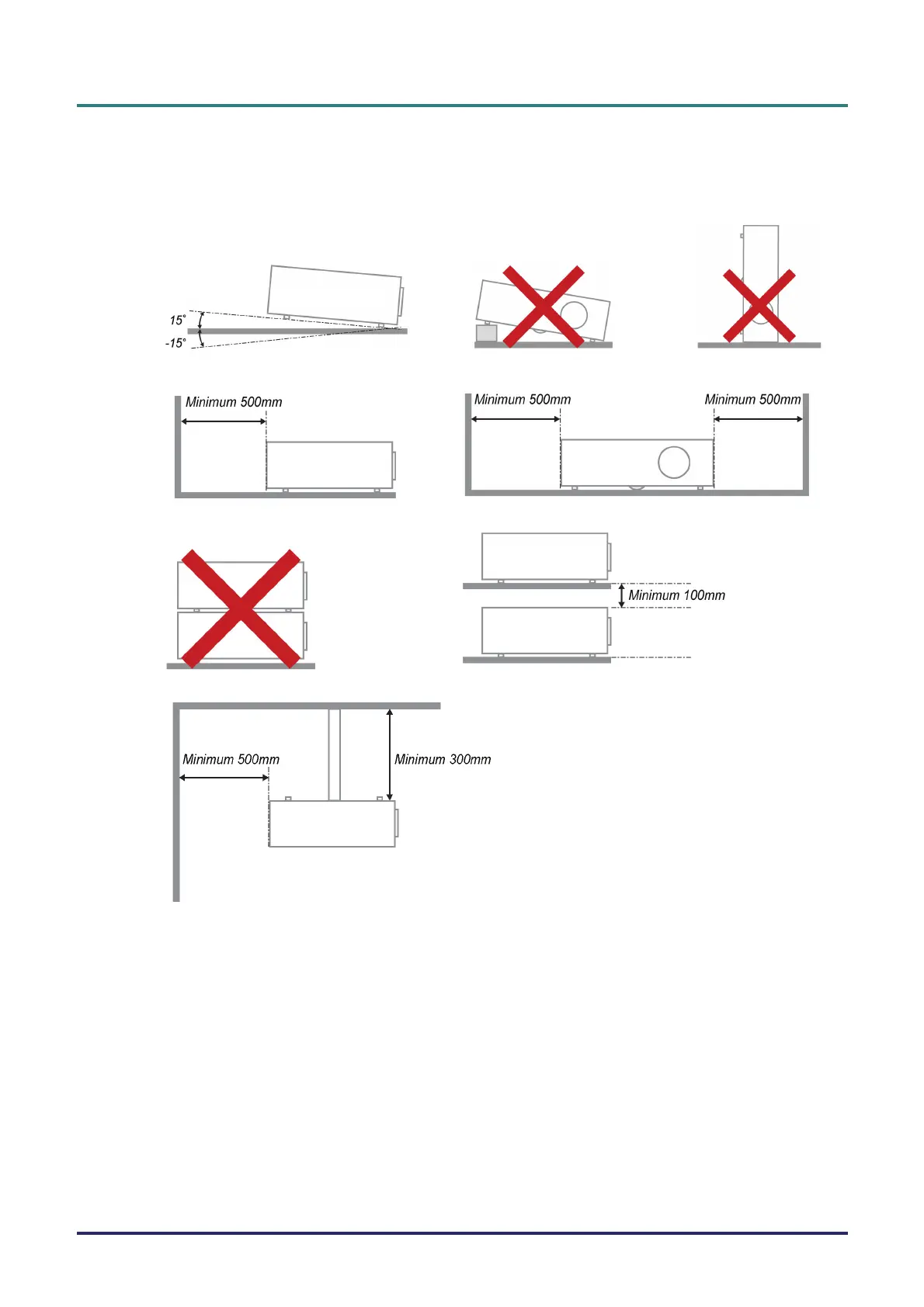 The tilt angle of the projector should not exceed 15 degrees, nor should the projector be installed in