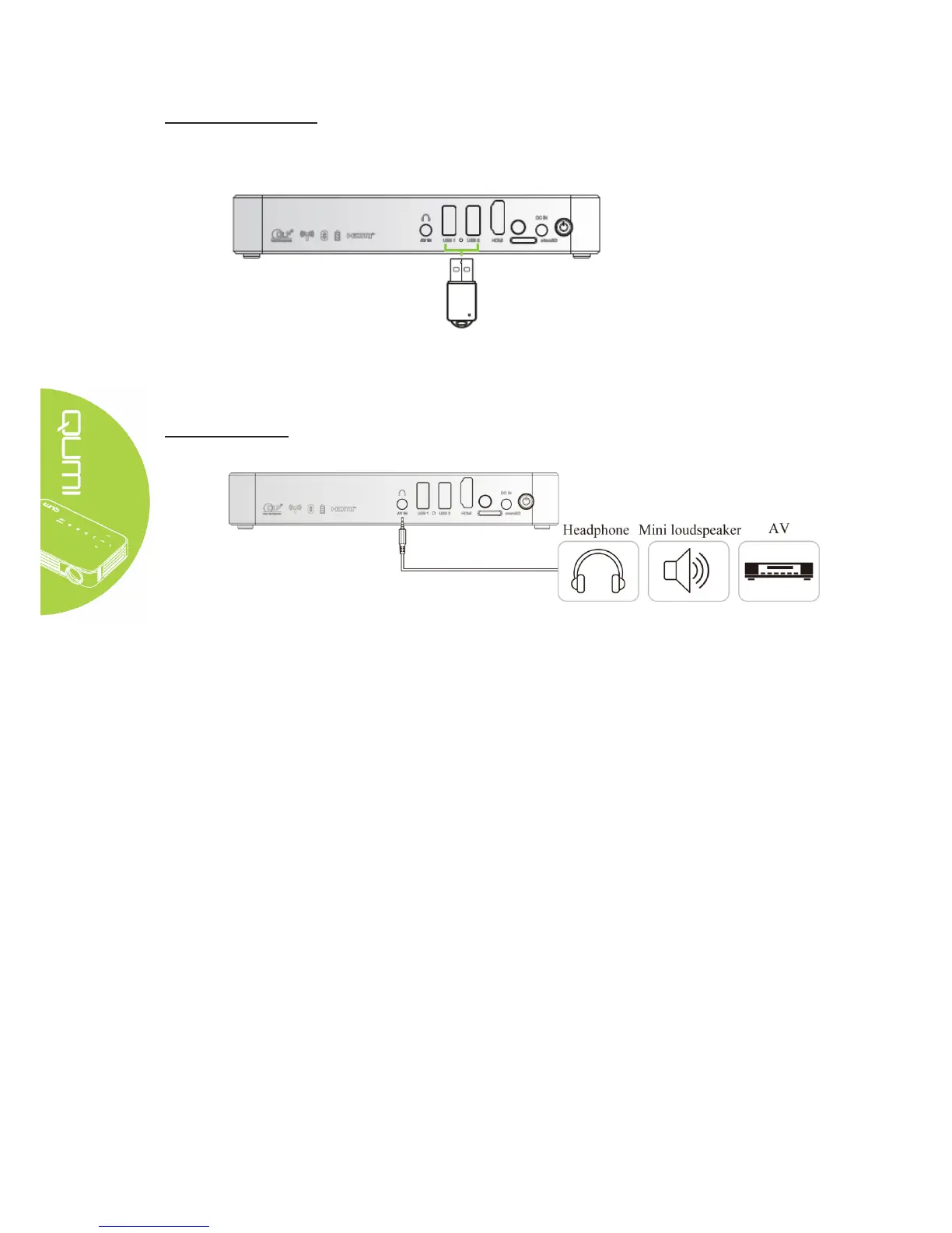 Connect a headset or a mini loudspeaker to the audio output jack for connection to Qumi.