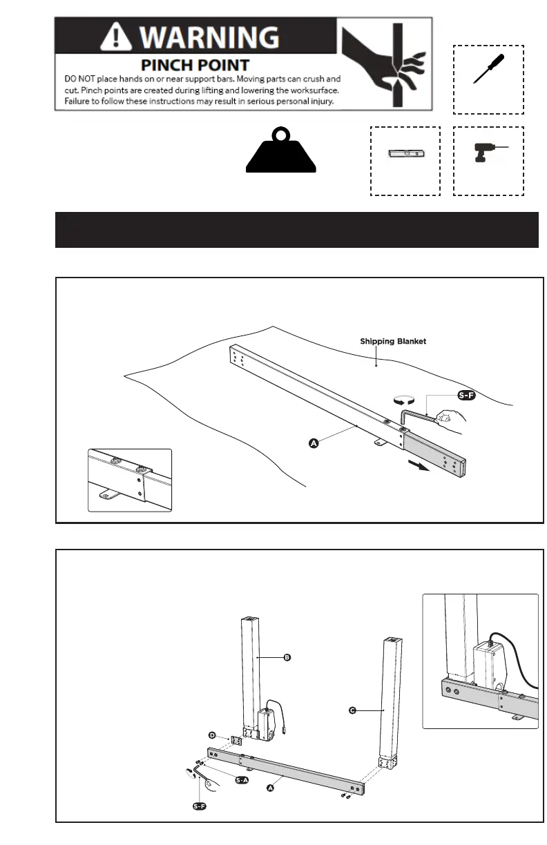 Place the crossbar spacer (D) on the motorized leg (B) as shown. Attach the