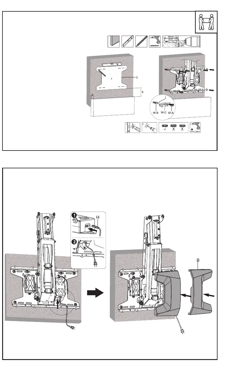 Plug the power cord (H) into mount (A). Place the cord into the slot as shown and snap the wall plate