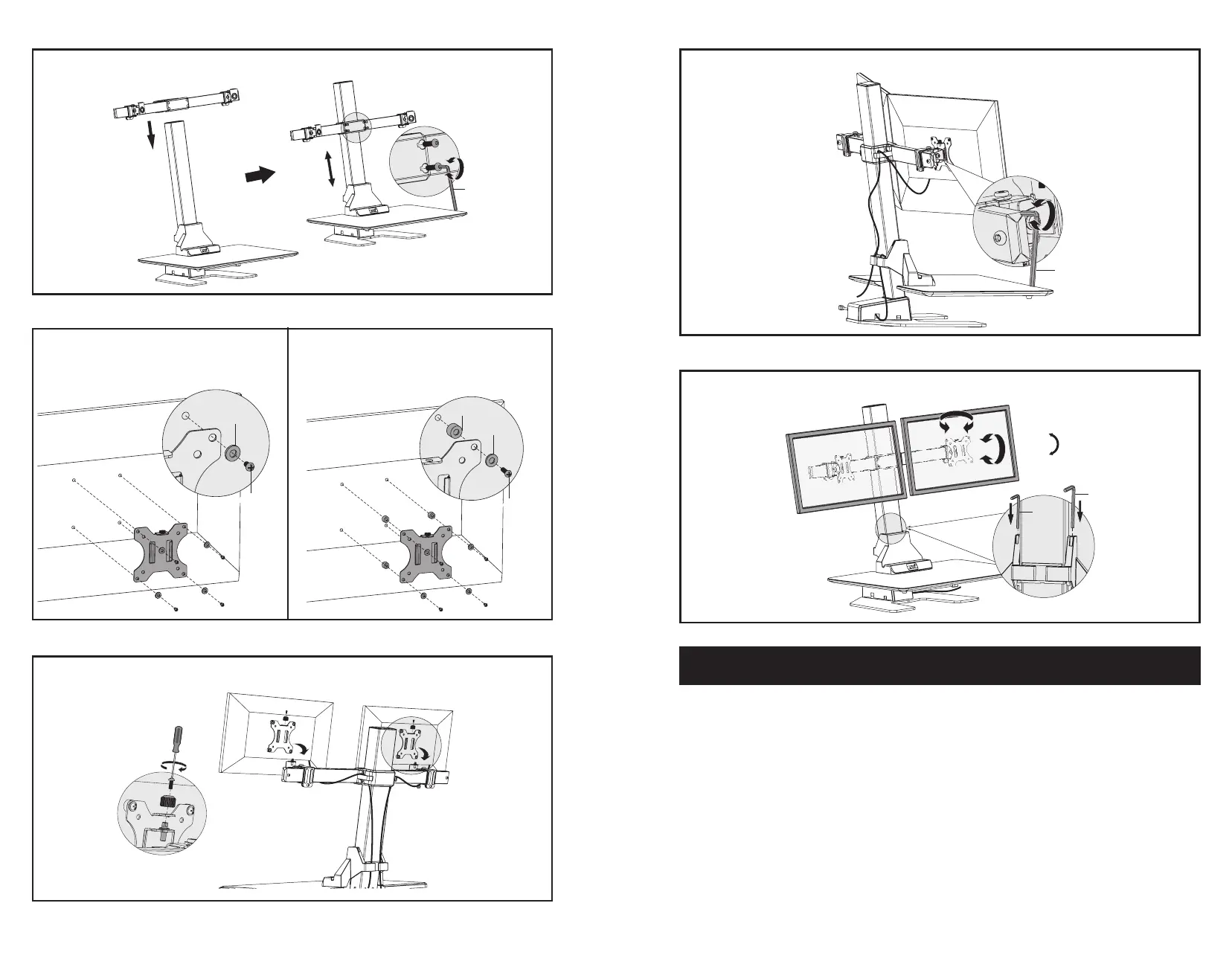 Attach VESA plates to the mounts of arm (D) using knobs.