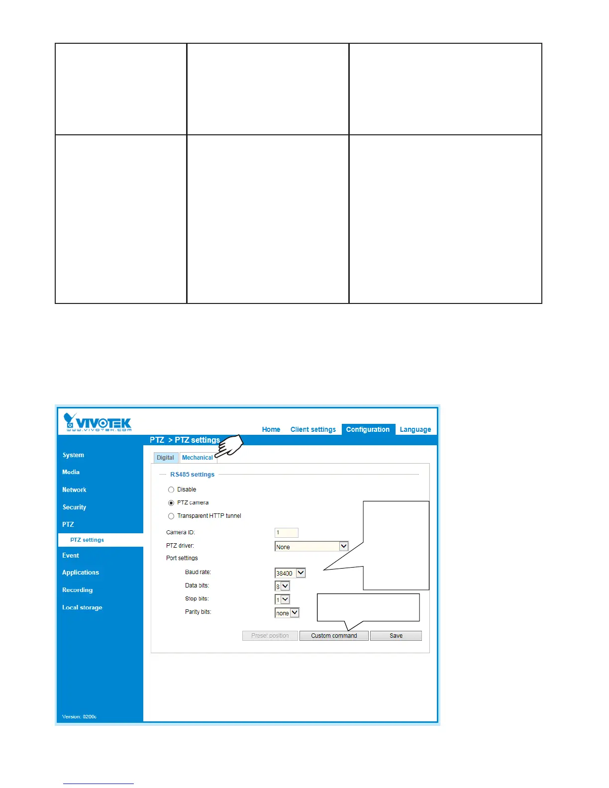 for the IR illuminator: Pelco D, baud rate - 2400, Data bits - 8, Stop bit - 1, Parity - none.