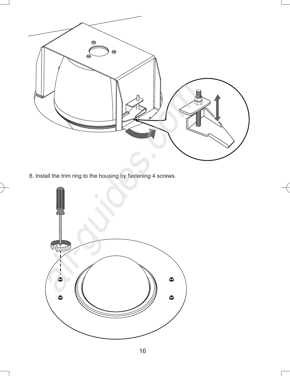 8. Install the trim ring to the housing by fastening 4 screws.