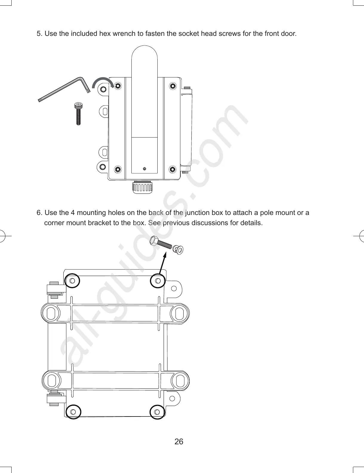 6. Use the 4 mounting holes on the back of the junction box to attach a pole mount or a