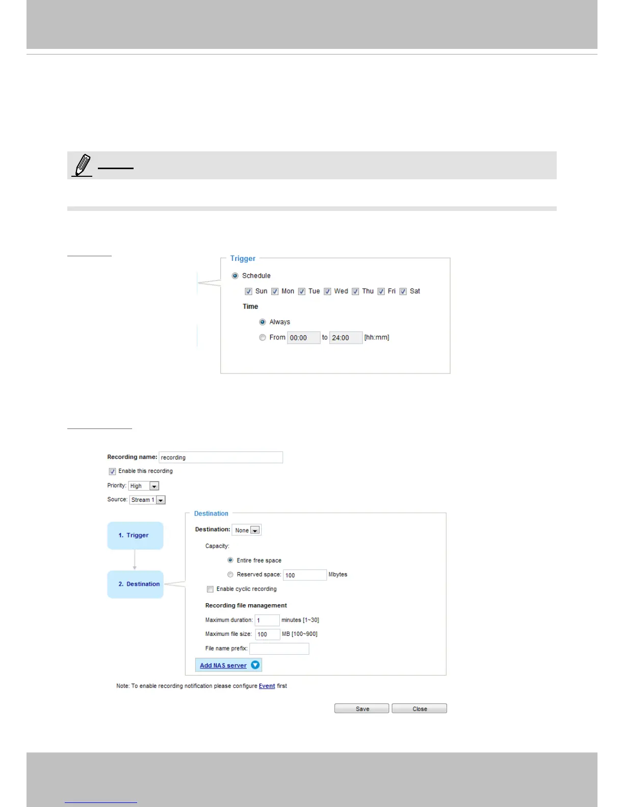 ■ Schedule: The server will start to record les onto the network attached storage (NAS).