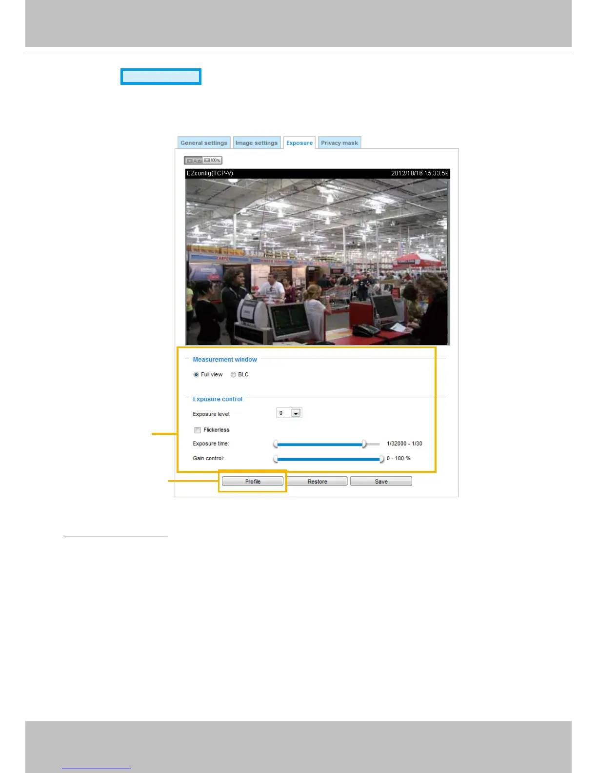 On this page, you can set the Exposure measurement window, Exposure level, Exposure mode,