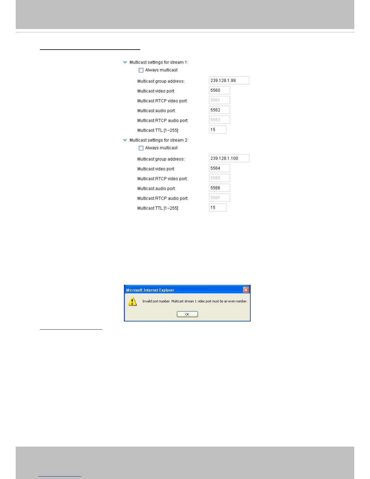 If the multicast RTP video ports are incorrectly assigned, the following warning message will be
