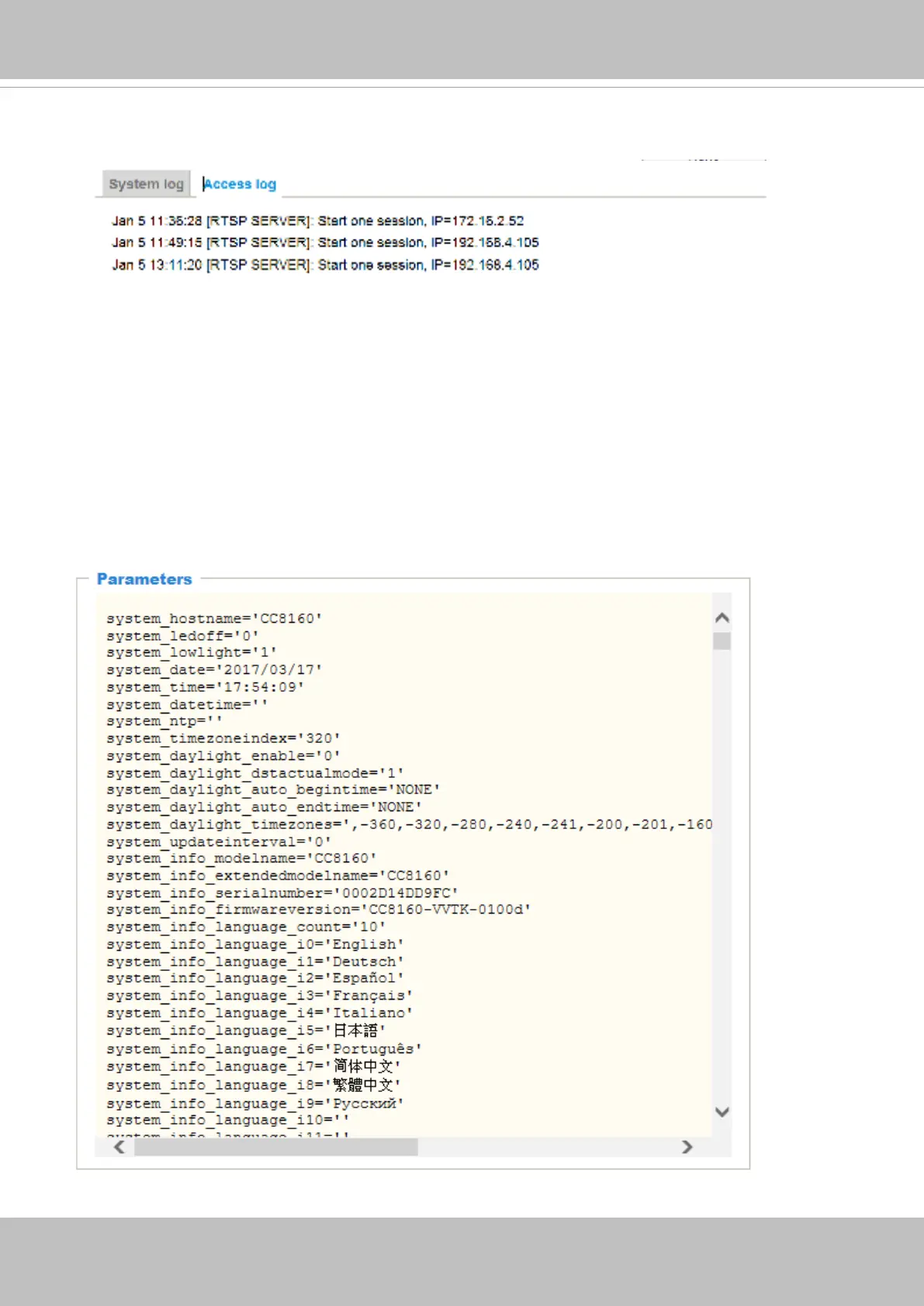 administrators) in a chronological order. The access log is stored in the Network Camera’s buffer area