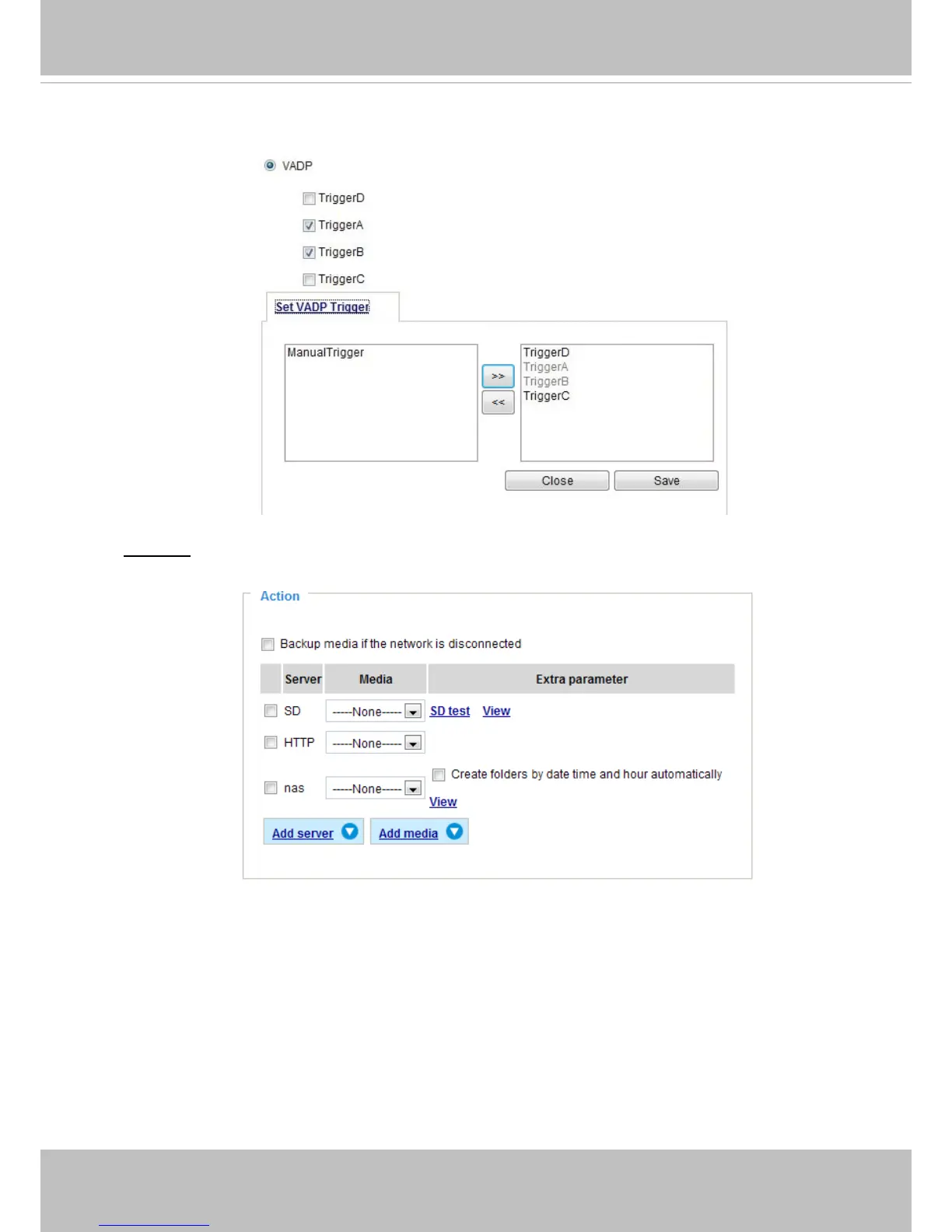 Dene the actions to be performed by the Network Camera when a trigger is activated.