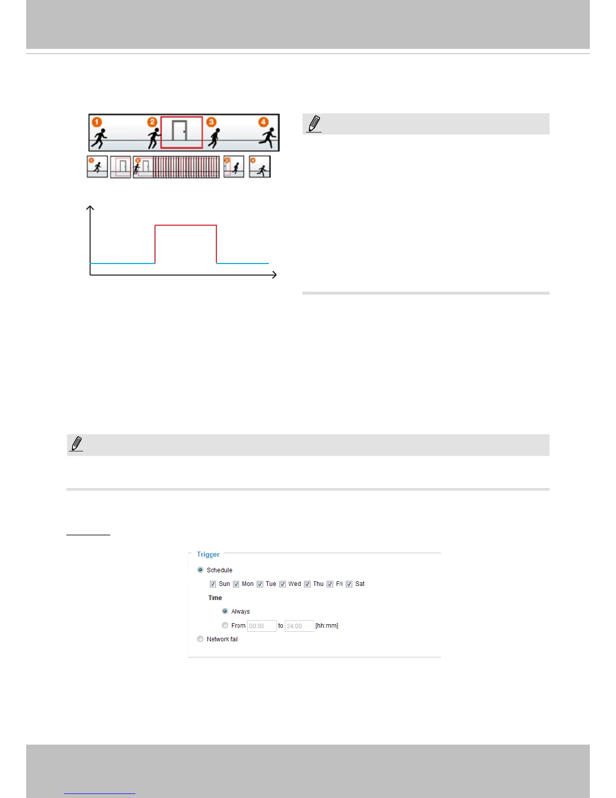 The alarm trigger includes: motion detection and DI detection. Please refer to Event Settings on page 104.