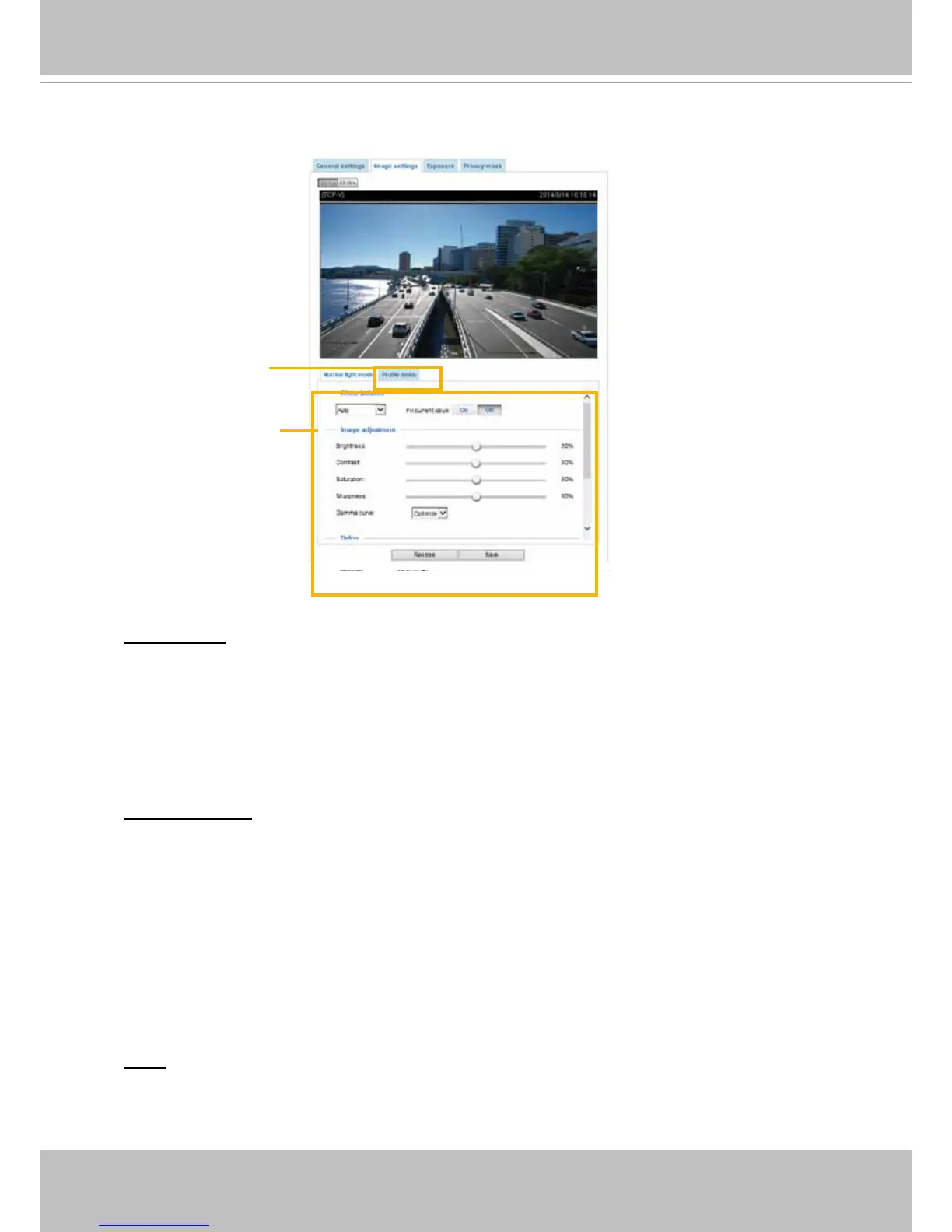 On this page, you can tune the White balance and Image adjustment.
