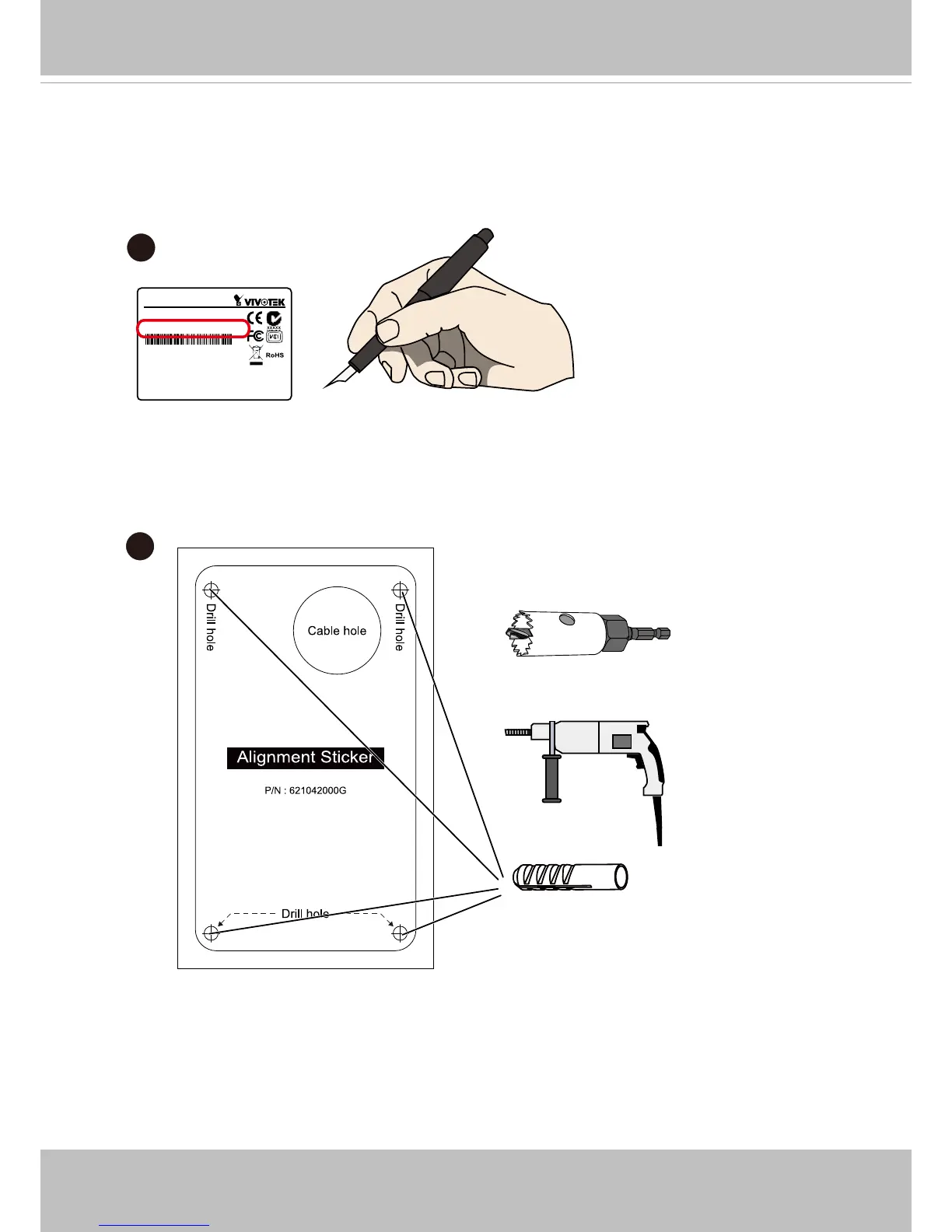 2. Attach the alignment sticker to a preferred location. Drill a cabling hole and the pilot