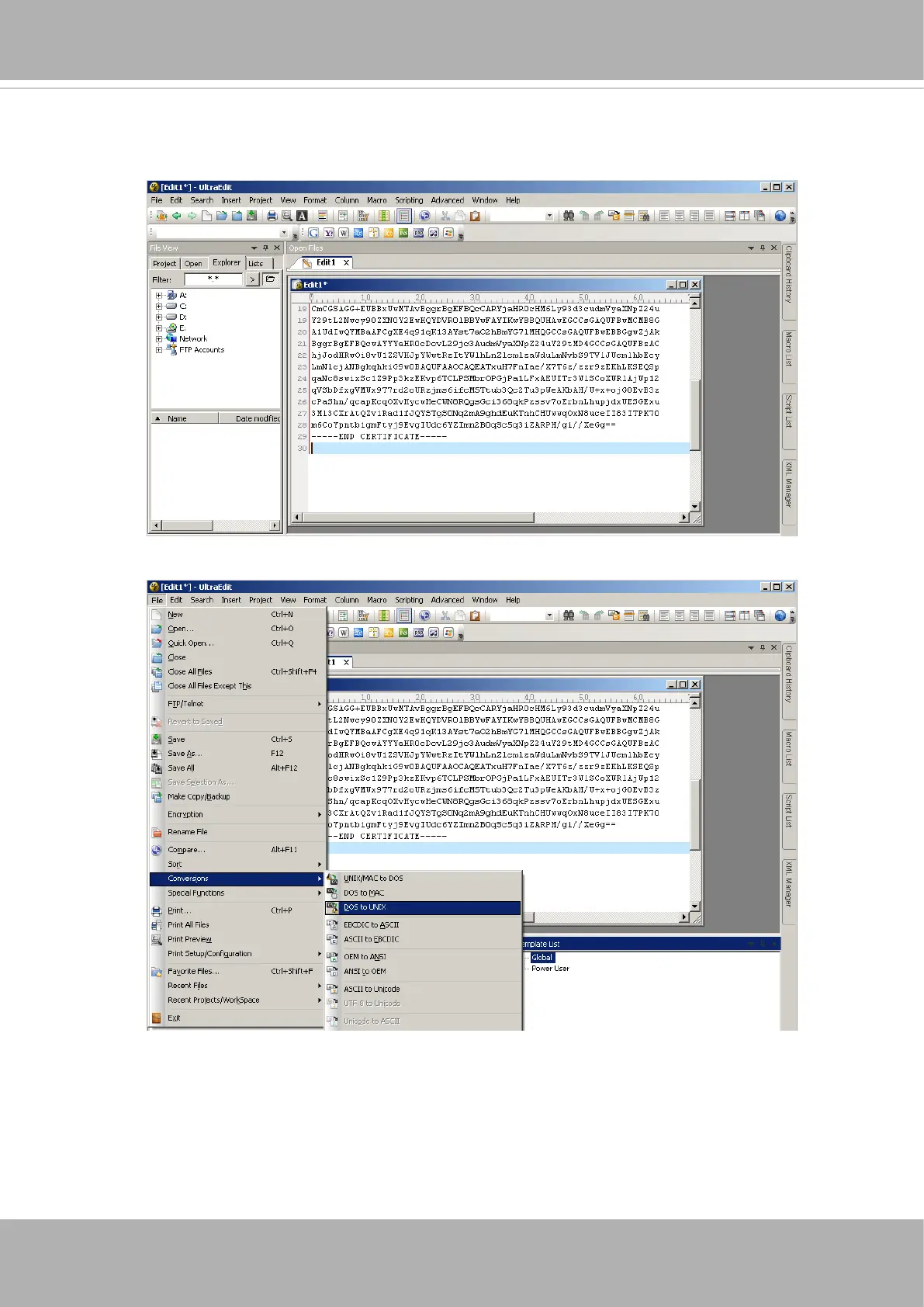 8. Convert le format from DOS to UNIX. Open File menu > Conversions > DOS to Unix.