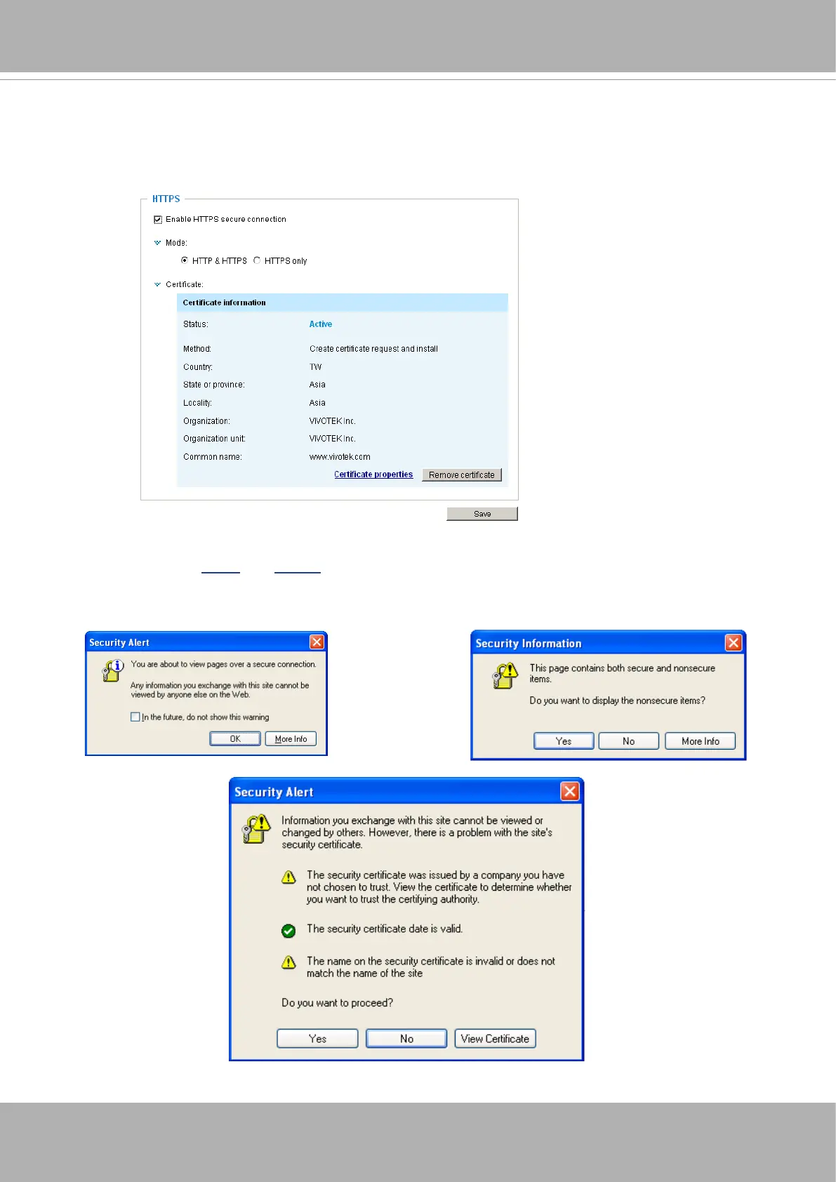 Security Alert dialogs will pop up. Click OK or Yes to enable HTTPS.