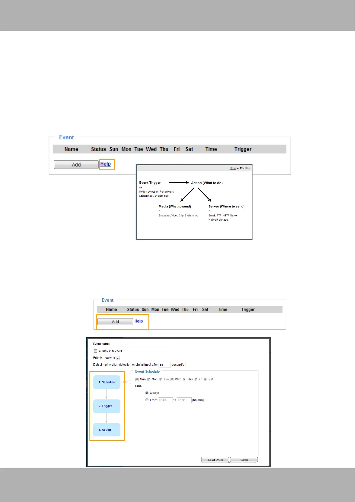 To congure an event with reactive measures such as recording video or snapshots, it is necessary to