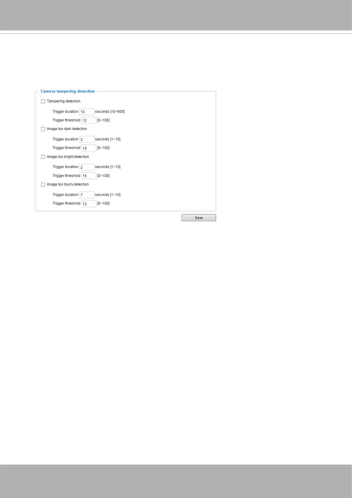 1. Click to select the checkbox before tampering conditions: Tampering detection, Image too