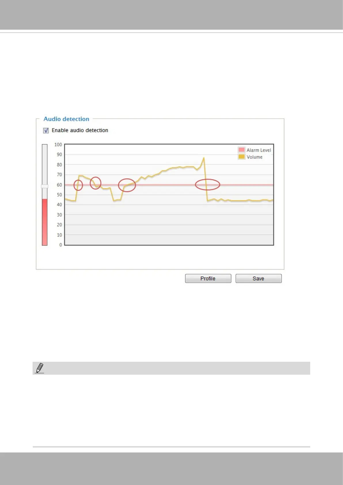 The red circles indicate where the audio alarms can be triggered when breaching or falling below