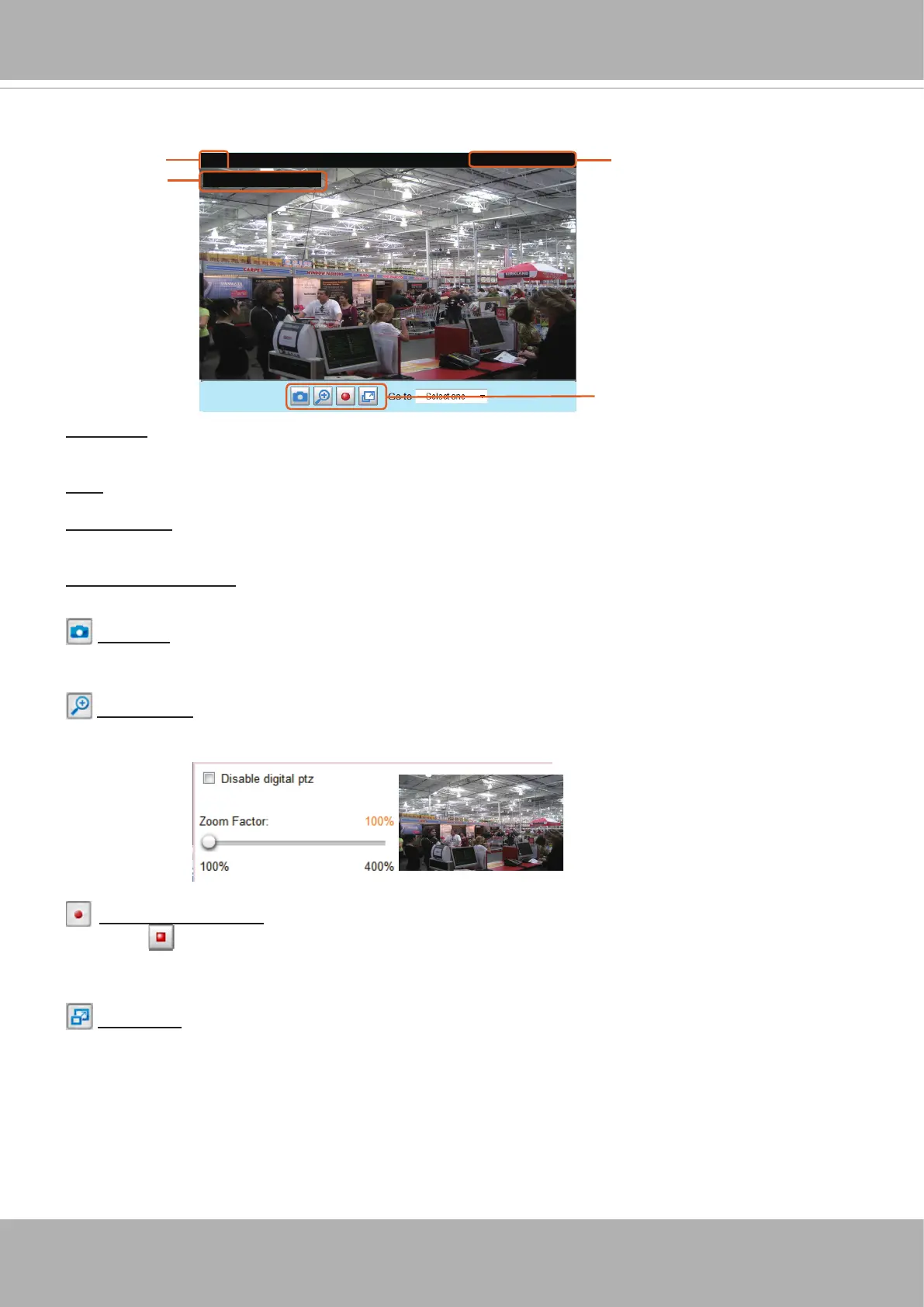 Snapshot: Click this button to capture and save still images. The captured images will be displayed