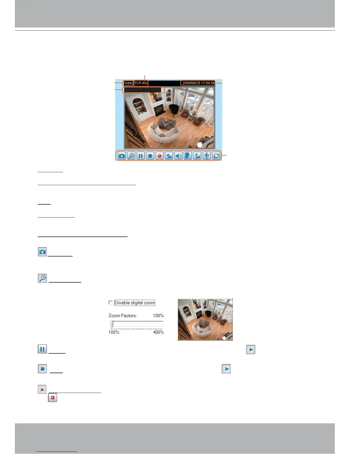 Stop: Stop the transmission of streaming media. Click the Resume button to continue