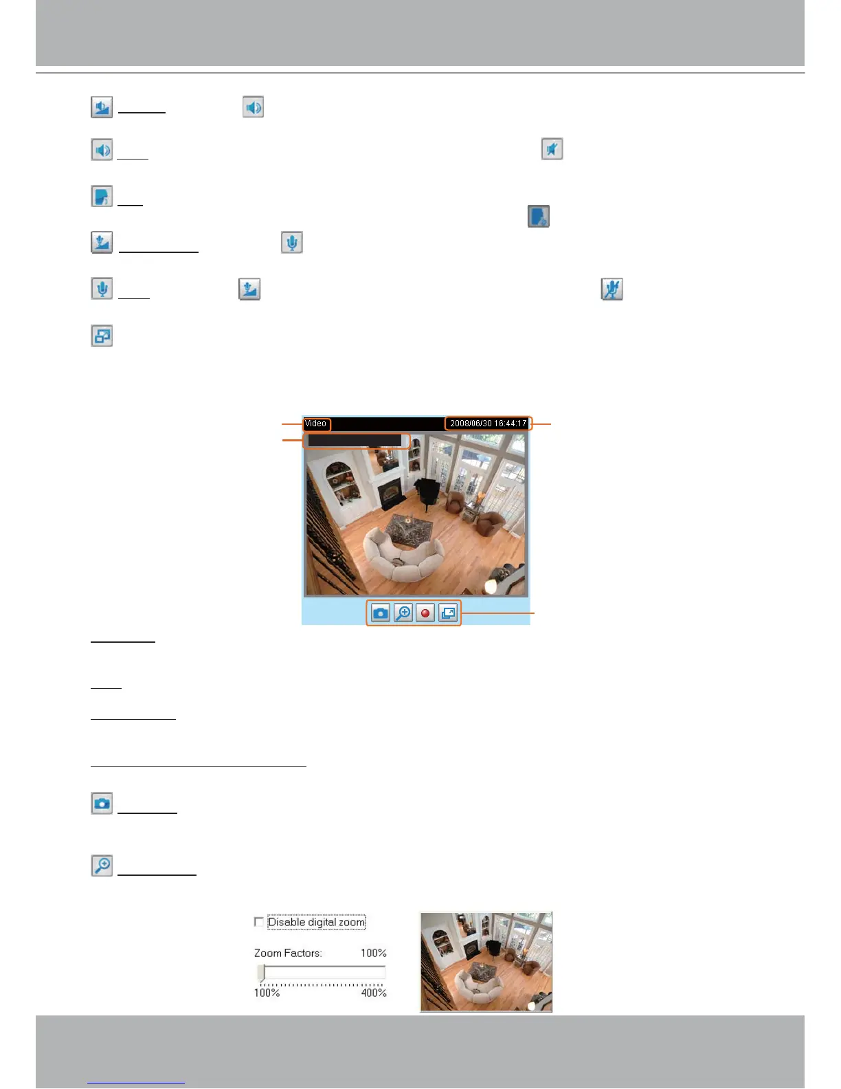 Video and audio control buttons: Depending on the Network Camera model and Network Camera