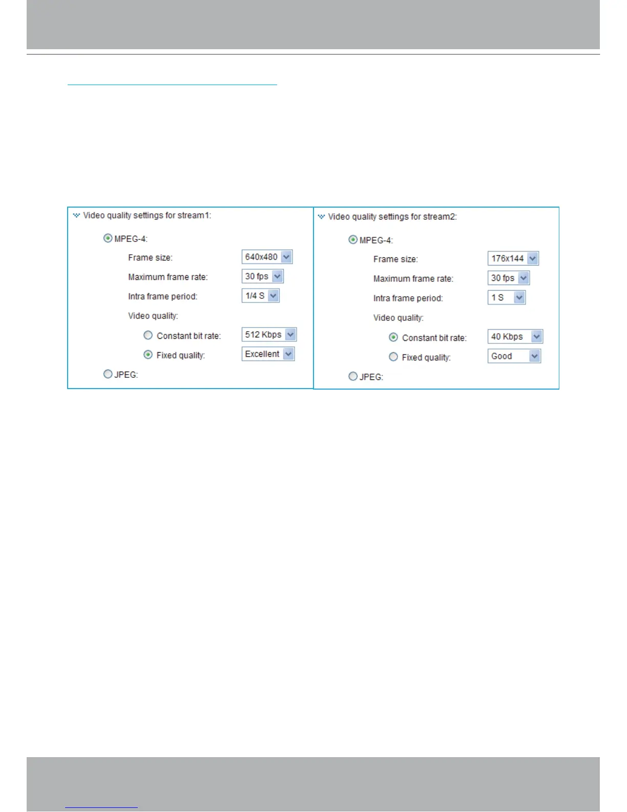 Video quality settings for stream 1 / stream 2