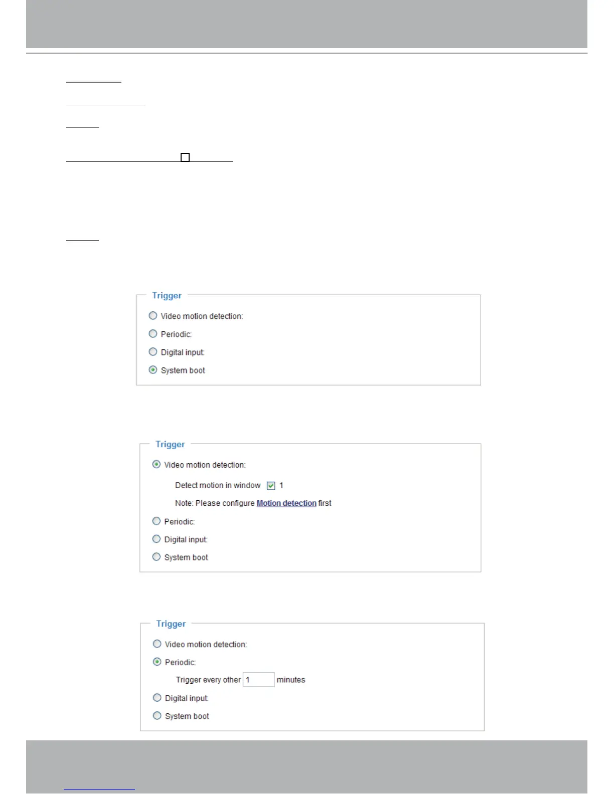 Also referred as the cause or stimulus, defines when to trigger the Network Camera. The trigger source