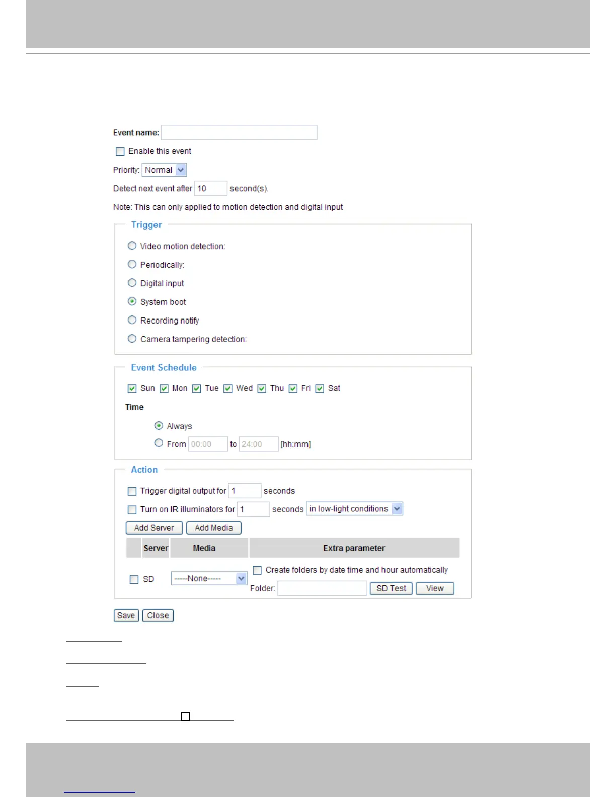 arrange three elements -- Trigger, Schedule, and Action to set an event� A total of 3 event settings can be