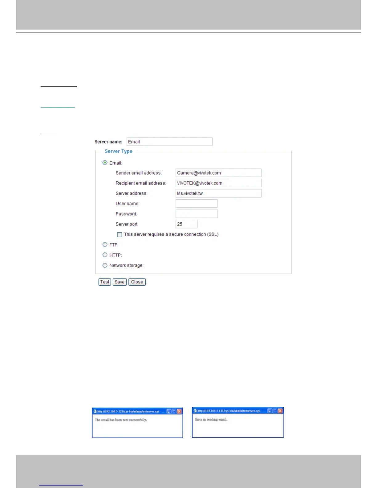 To verify if the email settings are correctly congured, click Test� The result will be shown in a pop-up