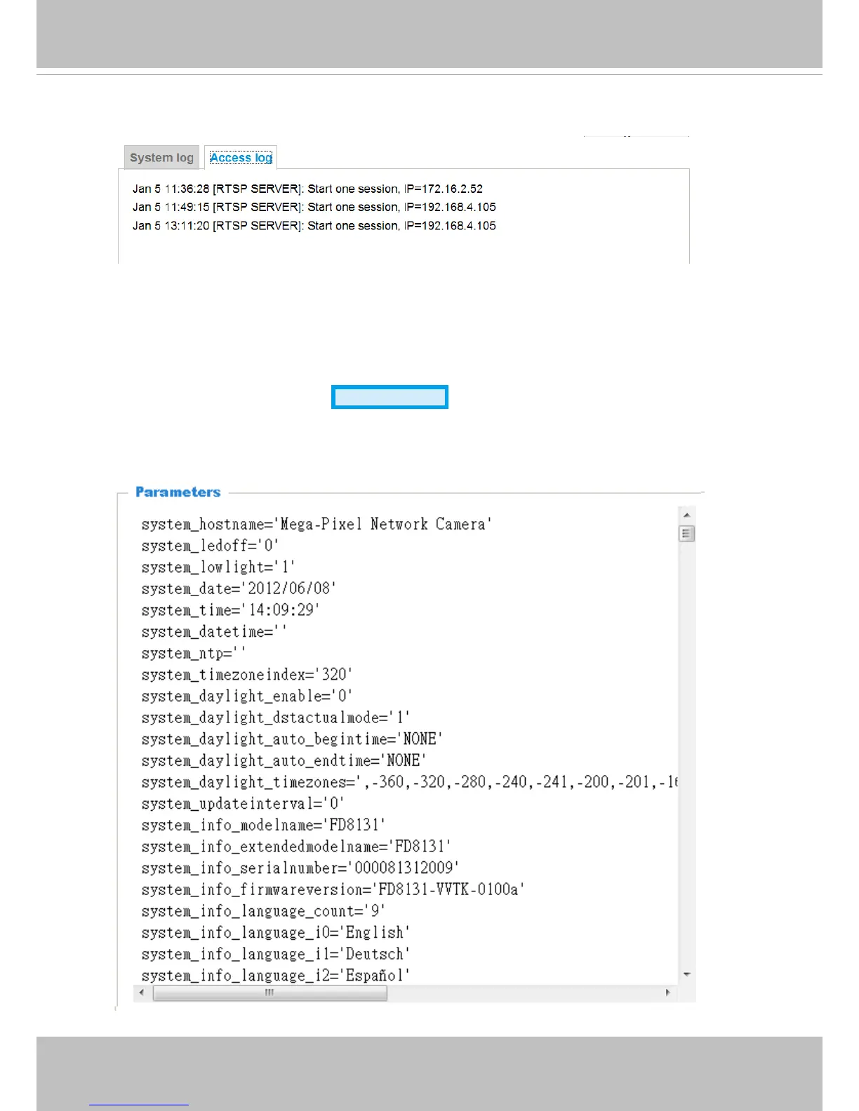 administrators) in a chronological order. The access log is stored in the Network Camera’s buffer