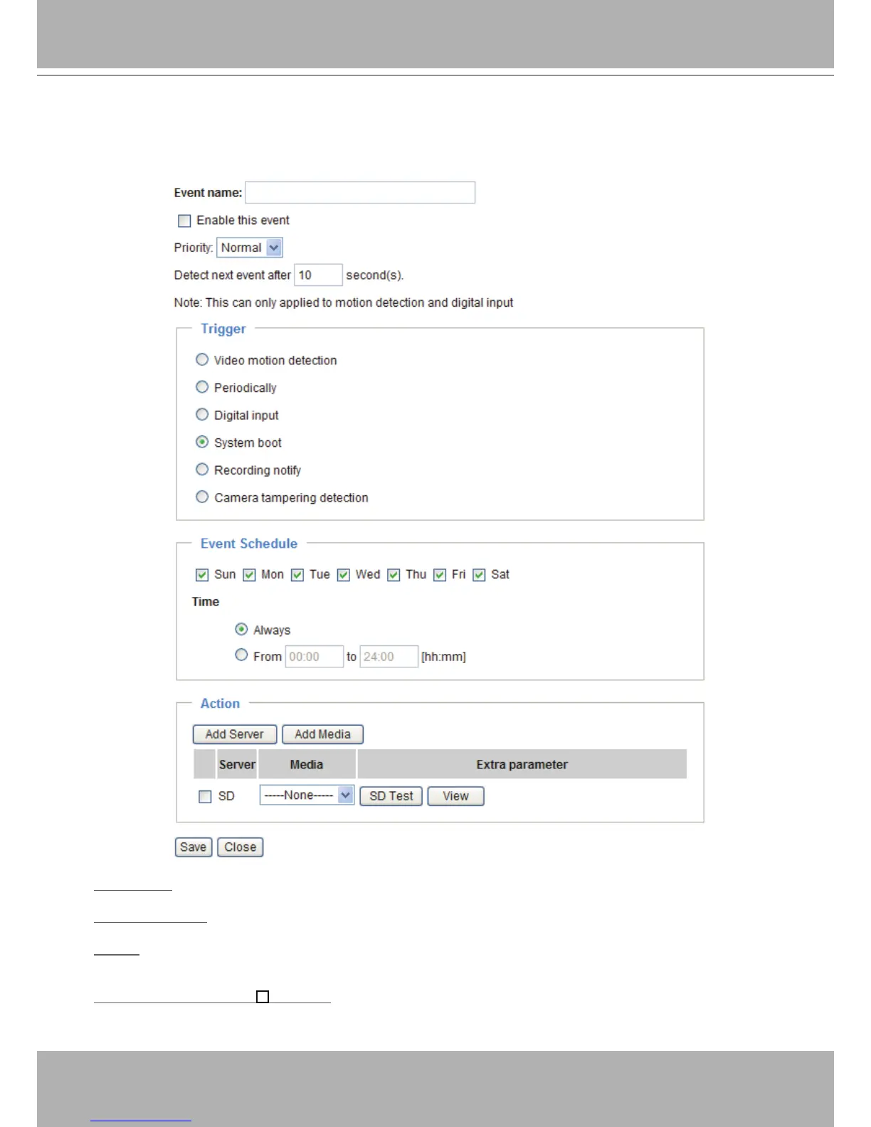 arrange three elements -- Trigger, Schedule, and Action to set an event� A total of 3 event settings can be