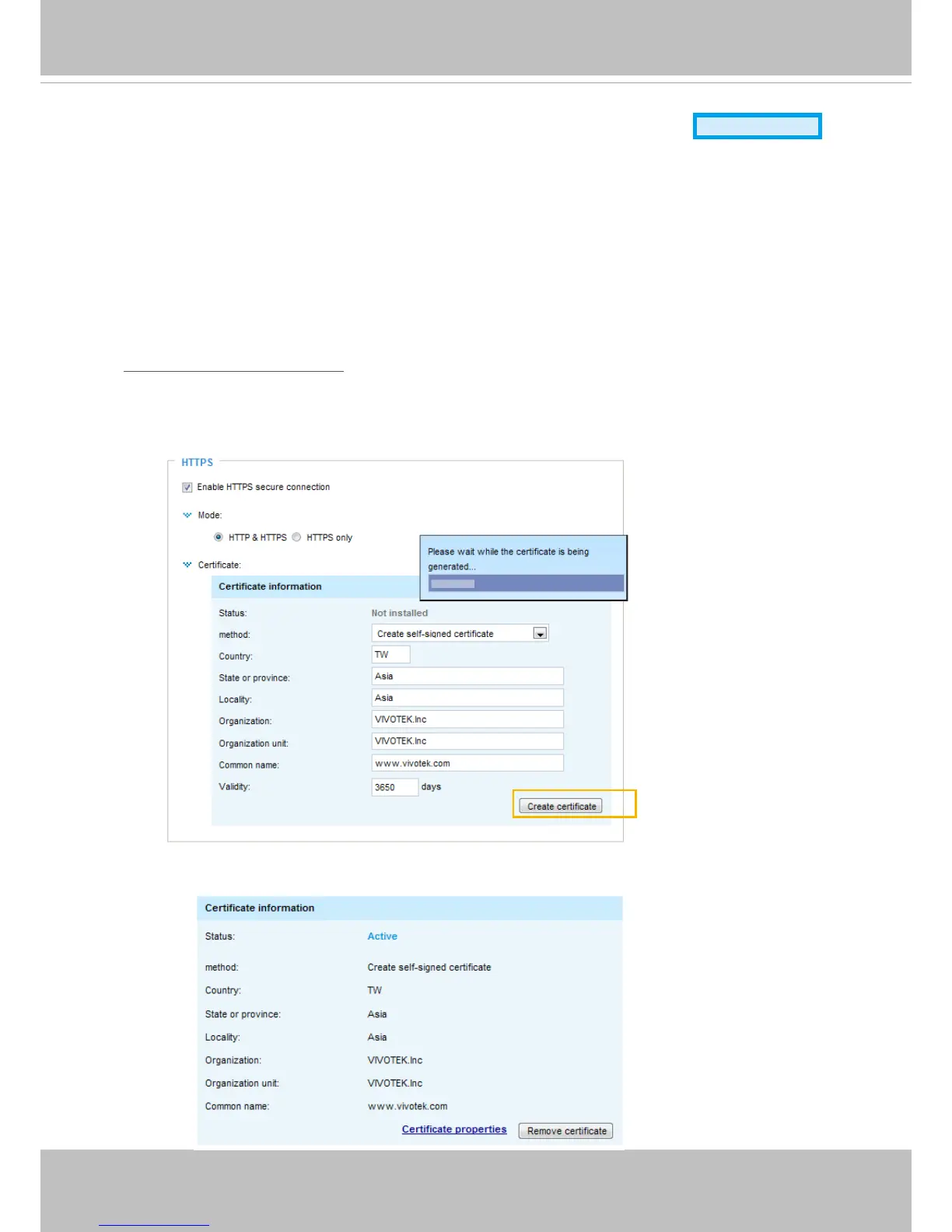 Before using HTTPS for communication with the Network Camera, a Certicate must be created