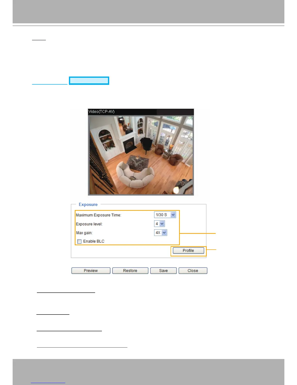 ■ Exposure level: You can manually set the Exposure level, which ranges from 1 to 8 (dark to bright).The