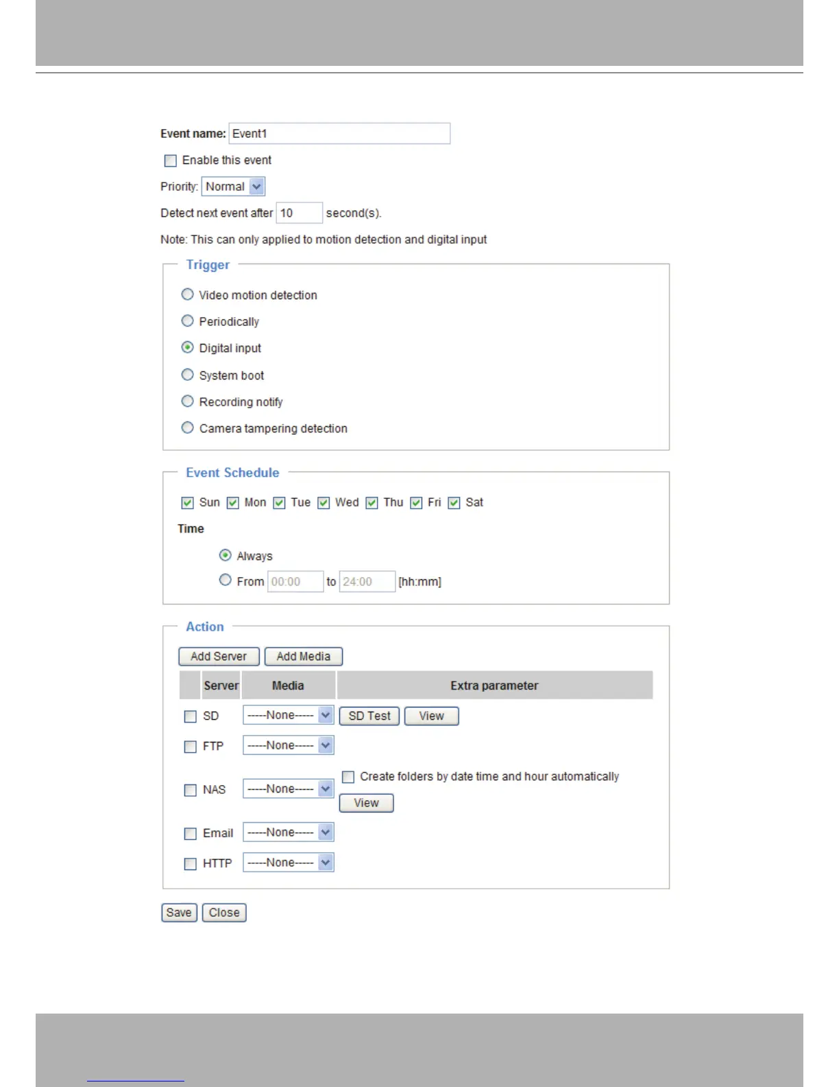 When completed, click Save to enable the settings and click Close to exit Event Settings page. The new