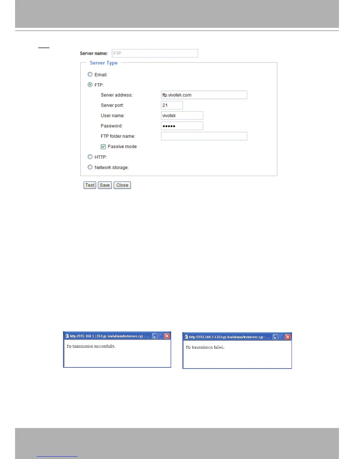 To verify if the FTP settings are correctly congured, click Test� The result will be shown in a pop-up