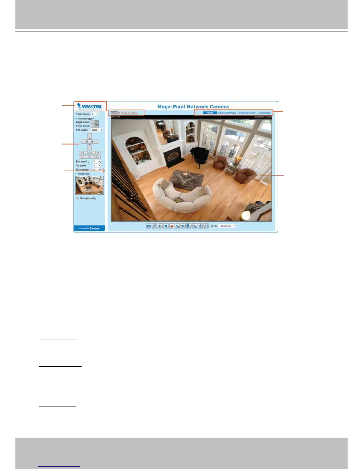 VIVOTEK INC� Logo, Host Name, Camera Control Area, Configuration Area, Menu, and Live