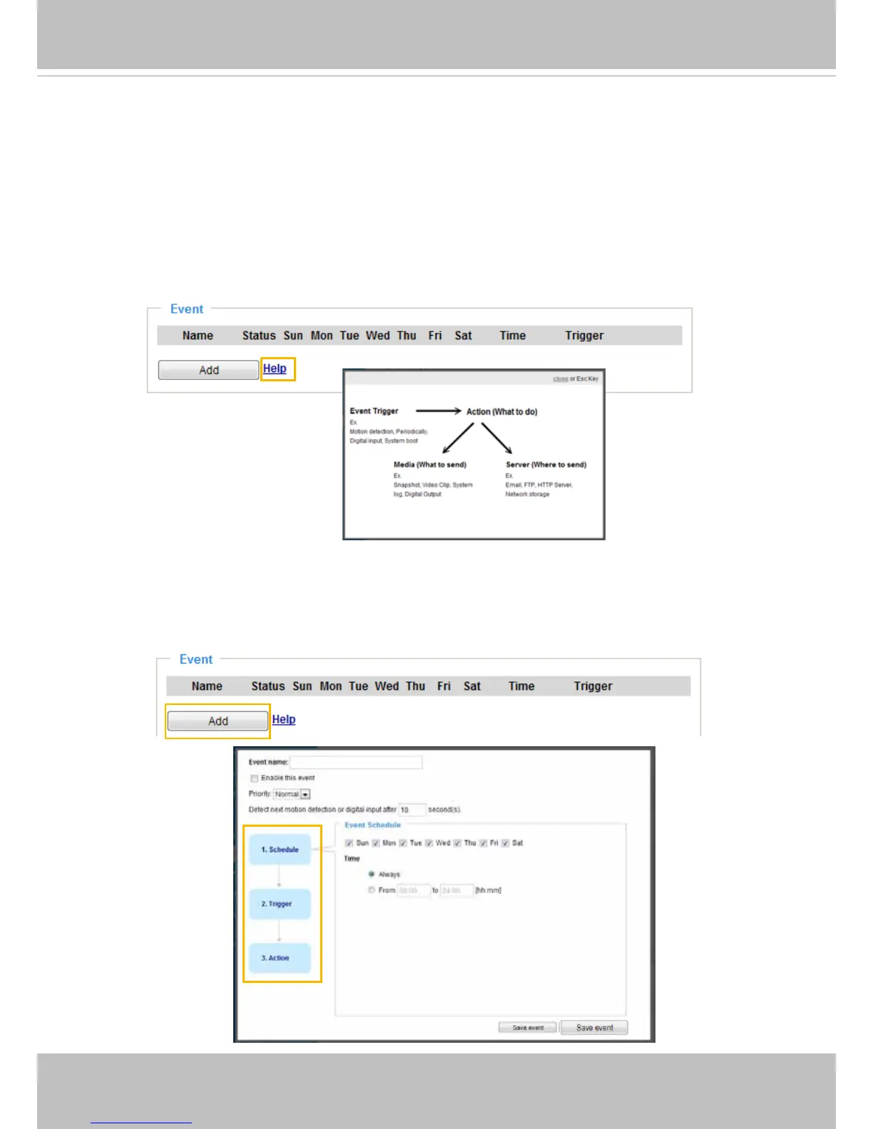 -- Schedule, Trigger, and Action to set an event. A total of 3 event settings can be congured.