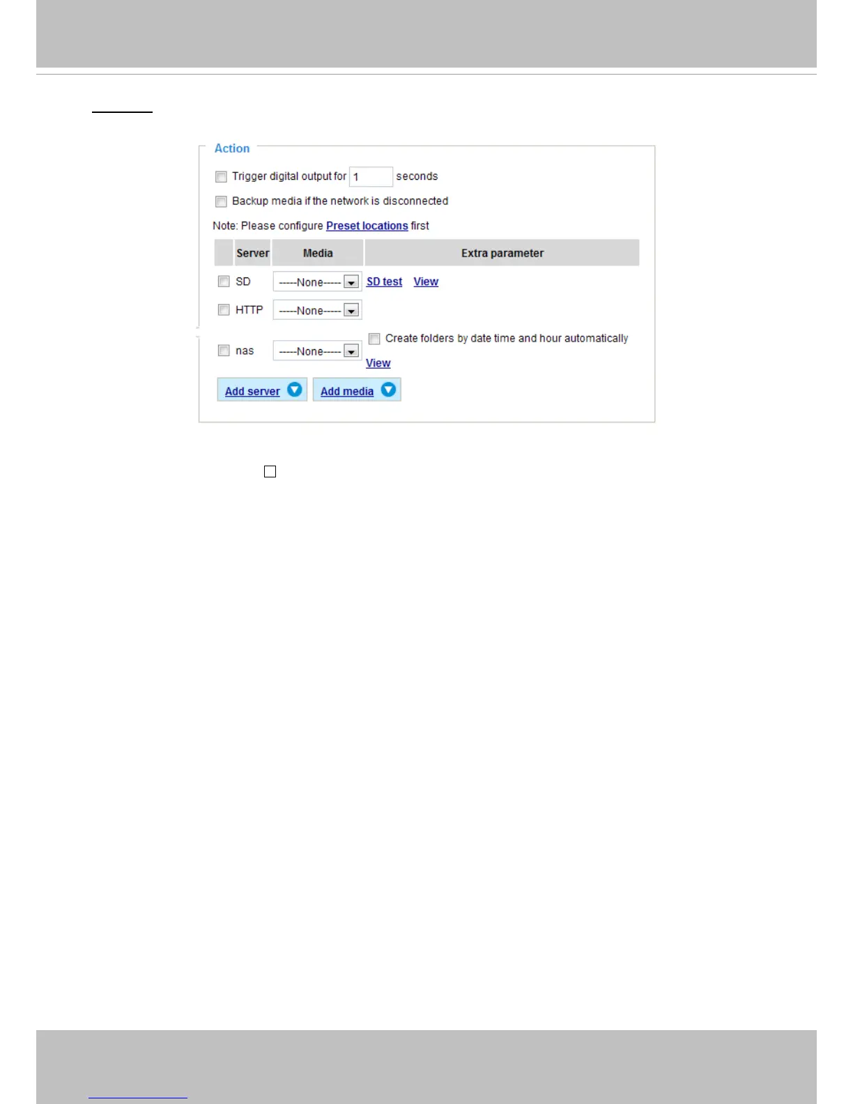 Dene the actions to be performed by the Network Camera when a trigger is activated.