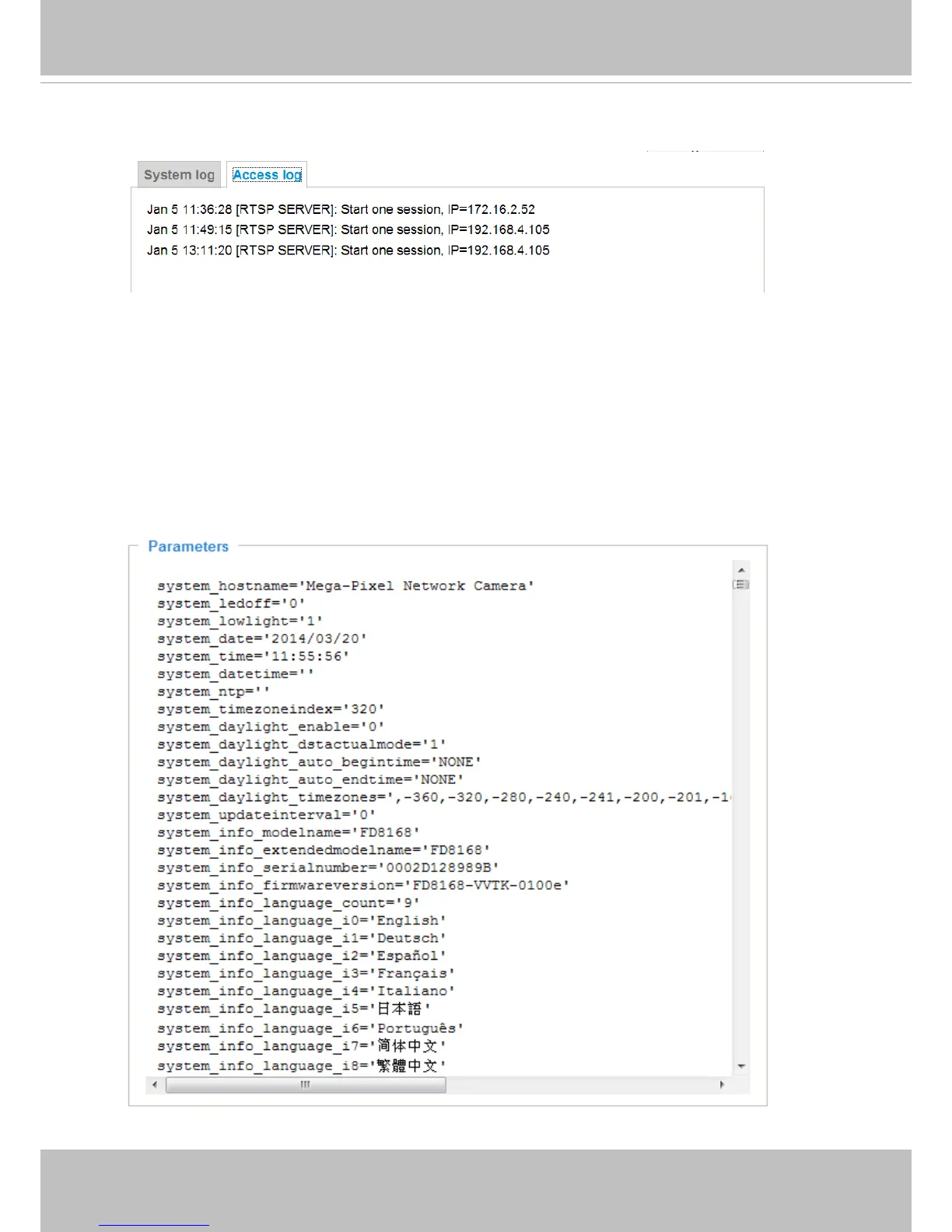 administrators) in a chronological order. The access log is stored in the Network Camera’s buffer