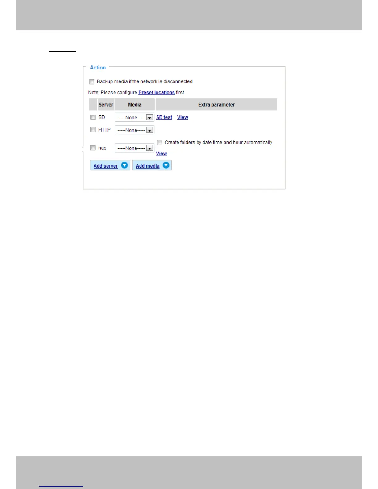 Dene the actions to be performed by the Network Camera when a trigger is activated.
